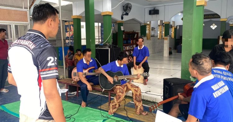 Pekalongan - Lima warga binaan Rumah Tahanan Negara (Rutan) Kelas IIA Pekalongan mengikuti kegiatan latihan band yang digelar di area Lapangan Rutan, Sabtu (27/12/25).